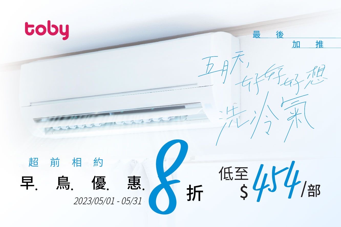 早鳥優惠最後衝一波🔥!即日起至5月31日,Toby 8折幫你清洗冷氣,折後每部價錢低至$454,無須輸入優惠碼,即可無限次使用8折優惠!冷氣同優惠一樣都係早「洗」早享受,趁夏天正式來臨前早啲洗冷氣,提早確保到佢喺最Fit嘅狀態,咁成個Summer都可以歎住舒服又涼快嘅冷氣啦🌬!
