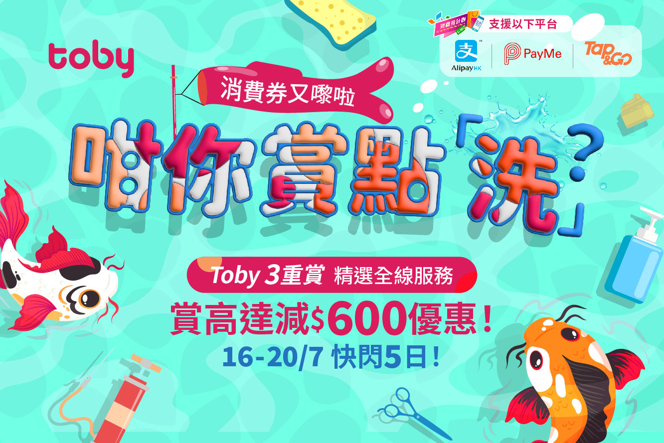 Toby都賞您對自己好啲💖由7月16至20日,一連五日推出消費券優惠3重賞,支援3大消費券付款平台,包括Alipay HK、PayMe及Tap&Go(ApplePay),等您精心挑選最想享受嘅服務,精明使用您張消費券!