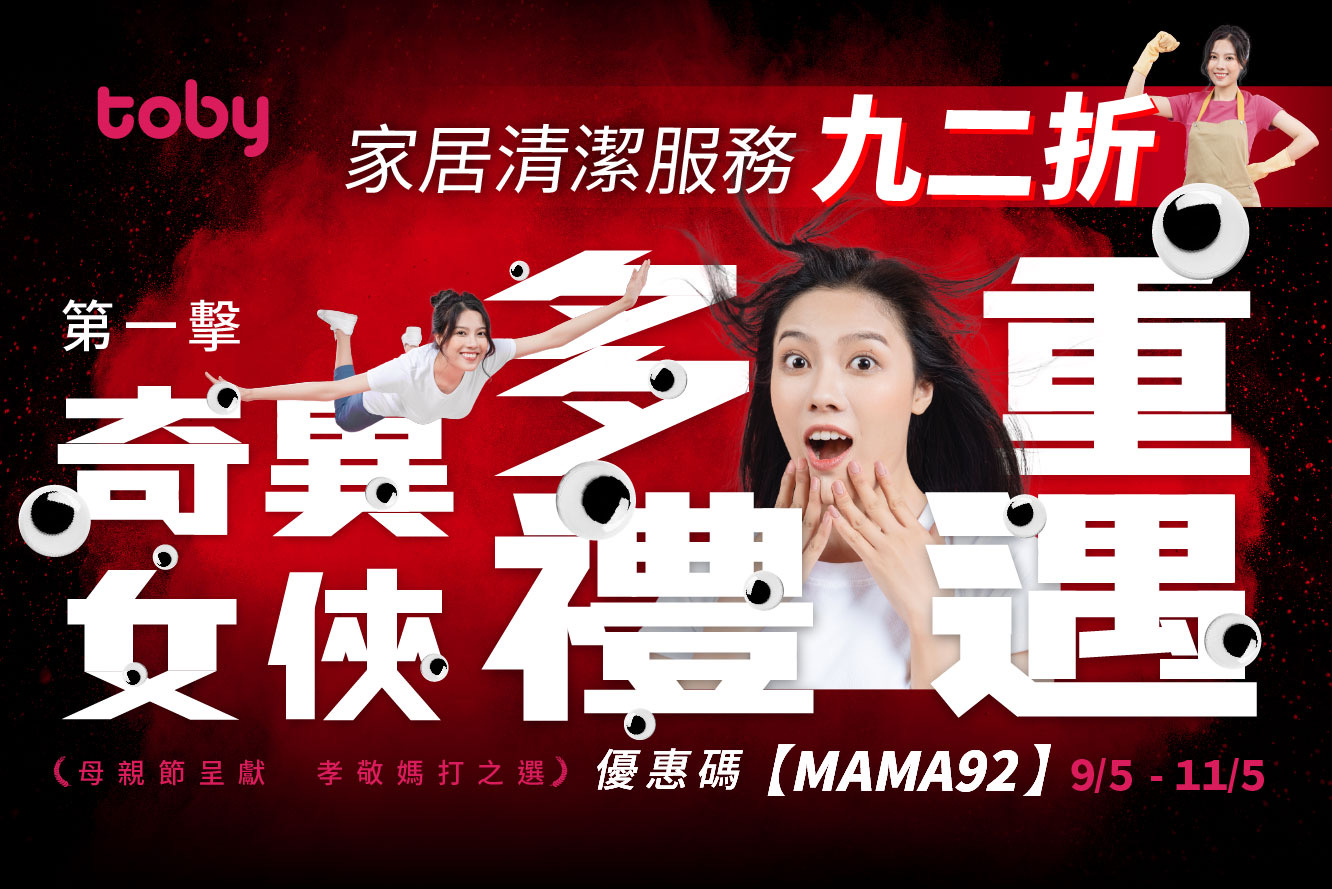 5月,一個頌讚母親真偉大的節日來到!想好好答謝一直為家庭無私付出的媽媽,現在就是最好的時機!由即日起至5月11日,輸入優惠碼<MAMA92>,預約Toby的家居清潔服務即享92折!給平日辛勞打理家頭細務的媽媽送上休息機會,立即以優惠價預訂Toby皇牌家居清潔服務套票,未來數星期家中各項清潔工作都能夠輕鬆辦妥,讓我們專業的家務助理為各位母親大人代勞!