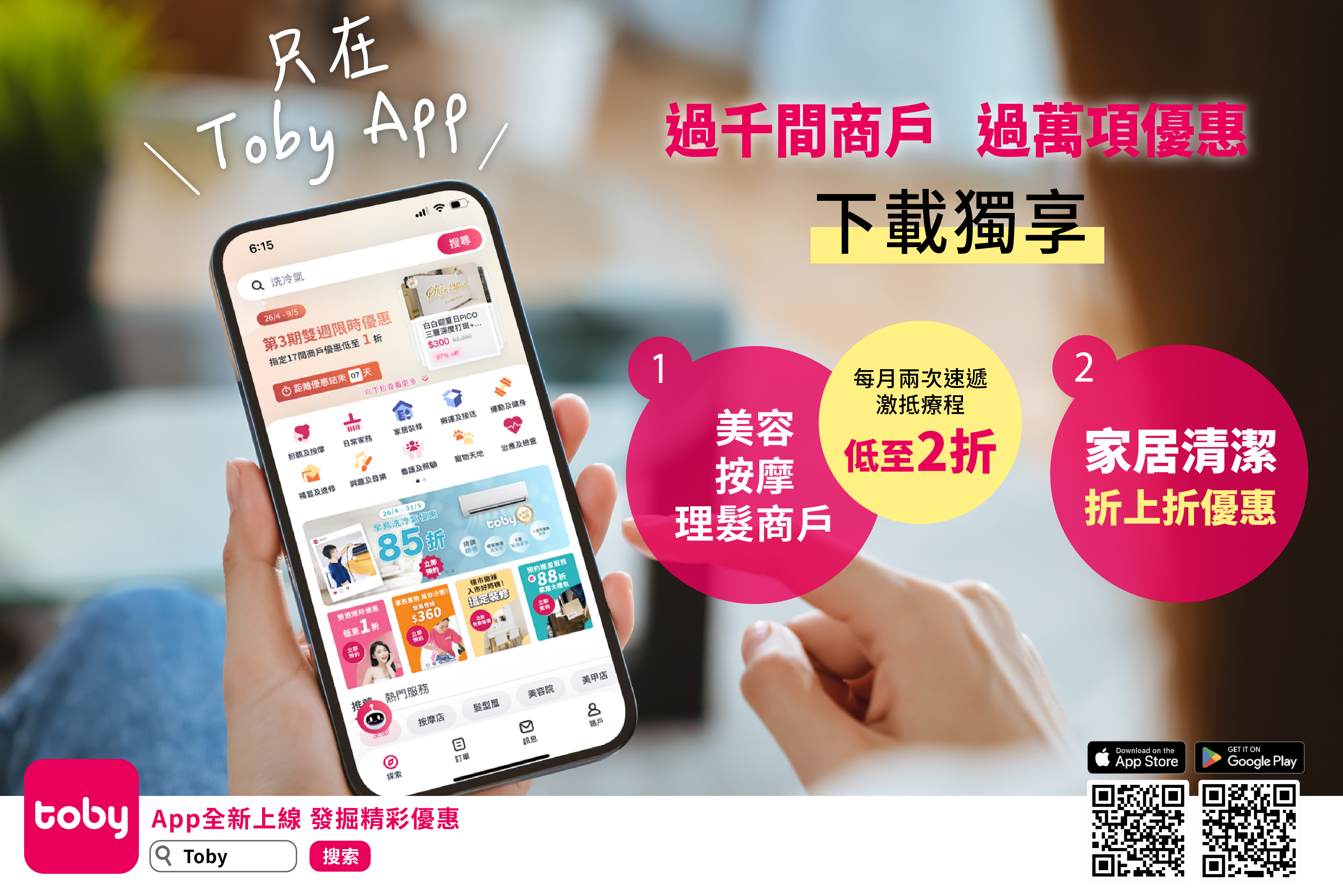 Toby擁有過千間商戶、過萬項優惠,我哋網羅全港最多💆♀️按摩🧏♀️美容💇♀️理髮商戶療程及獨家優惠;亦有各項優質家居清潔/裝修服務供大家直接預約,更提供用戶評分及真實評價,透過App即可輕鬆用優惠價預訂你嘅心水商戶,同時一站式兌換服務⭐